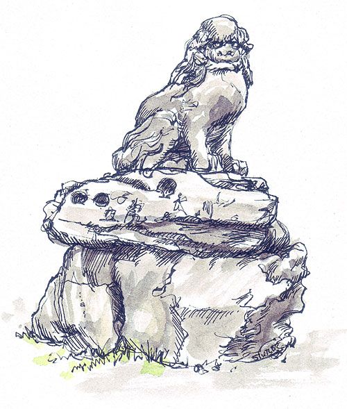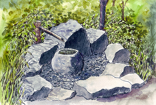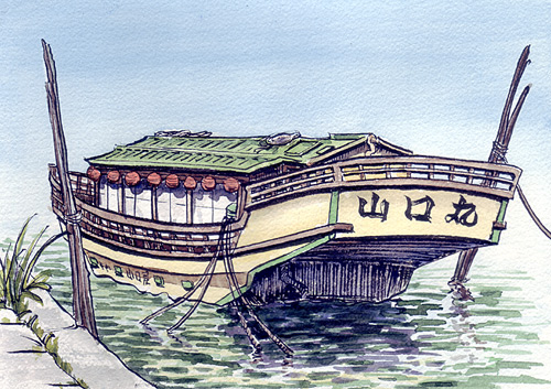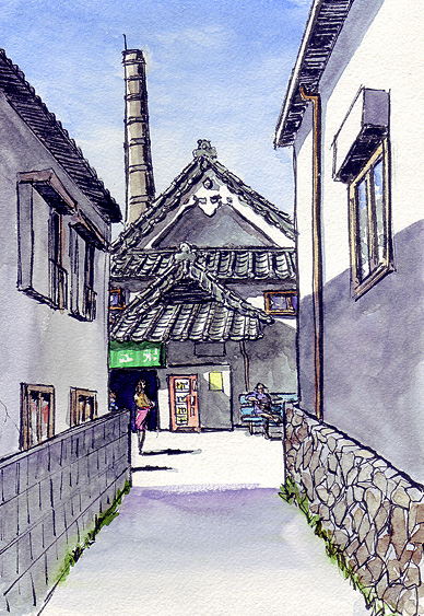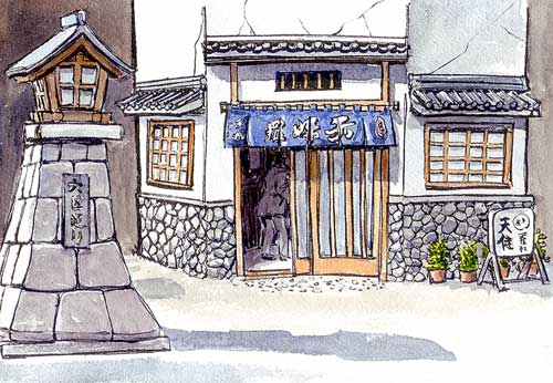 Page 2 Shishi in Asakusa (spring, 2005) This is an ink and watercolor sketch of a "shishi" on the grounds of the temple compound Sensoji temple in Asakusa, Tokyo. I stood the whole time for this one since I was in the middle of a walk way that leads to a temple, and there was no place to sit. I used both a brush pen and fountain pen, both filled with carbon ink. It was then finished with watercolors from my little portable wooden sketch kit. ![]() Shishi statues depict mythical beasts that resemble lions. There are always two of these statues guarding both sides of the entrance to Buddhist temples and Shinto shrines. One always has its mouth open and the other has its mouth closed. Looking at this one, it's apparent I drew the one with the closed mouth. It was on the left side of the path guarding one of the many temples in the area. I've drawn shishi statues before, mainly because they are usually very interesting, and they stay perfectly still. While most shishi rest on a pedestal of carved stone blocks, this partcular shishi was resting on a couple of old stones left in their natural shapes, having been carved by nature and the elements over the years. Hokusai drew a shishi every morning in his old age, for good luck. Asakusa is a great place for a sketching day. This soba (noodle) shop was not too far from the temple grounds. It stood on a sunny five way street corner in a very old looking neighborhood. ![]() Soba shops can be found everywhere, and are very popular. Thes are very small and fill up with customers very quickly at lunch time. No problem, there is often another soba shop just a few doors down the street. I go for day long walks around Tokyo, and often find that the only eateries to be found in out of the way neighborhoods are soba shops or ramen shops. Some people can eat noodles every day, but I'm not one of them. Back at the mighty Arakawa river, I sat down and sketched yet another yagata-bune. As I've mentioned before I've always wanted to go for a cruise on one of these floating party boats. For now I'll settle for sketching them from the land. The name of this one is the Yamaguchi maru. Maru is the suffix on every boat name I have seen in Japan, and it basically means round, or circle. I have no idea why it is used for boat names. Yamaguchi is a common family name. ![]() As I sketched this, a man came up and stood in silence behind me for the longest time, which I still find unnerving no matter how many times it has happened to me. Finally he commented that Mr. Yamaguchi would probably be very happy to have this sketch. I wondered if perhaps he was Mr. Yamaguchi himself, and whether or not I should offer this sketch in exchange for a free cruise. I gave up on that idea as the man walked away. I made this next sketch when I was walking though Kiba Park in Tokyo. There is a quiet fenced in section in the park that features all kinds of flowers. Within that area is a secluded traditional rock garden surrounded by a small bamboo fence. In the corner of this rock garden I found this spring surrounded by stones. In the center is a carved stone basin to catch water that comes from a bamboo water outlet. ![]() I was moved by the way the light was filtering through the foliage, casting shadows on the rocks. It was such a peaceful scene on a beautiful spring afternoon. As I sketched, a bird landed on the tall rock in the center behind the basin and proceeded to scold me loudly for disturbing the tranquility of his garden. I would have sketched the bird, but the result would have looked contrived. What are the chances of a bird actually sitting in the middle of such a scene? Even though he was there, who would believe it? Anyway, he flew away before I had a chance to reconsider, This was done with carbon ink in a brush pen plus watercolors. This is a sketch of a "sento" or public bath. In the past ten years or so, most neighborhood sentos have been torn down as more new homes are built with their own baths, but there was a time when practically no home had a bath, and sentos flourished. ![]() My first apartment in Tokyo had no bath, and I have fond memories of my evening trips to the sento down the street. The tub is big and deep, and some can fit a dozen people or more (and yes, they are segregated by gender, at least in the city). The water is very hot, goes to about the neck when you're sitting, and very relaxing; a great way to wash away stress. You can see people gathering around the entrance at 4:00 in the afternoon, when the sento opens for business. You can recognize a sento by its old architecture resembling some Edo era Japanese castle, plus the tall smoke stack. I found this one in Ichikawa which is just outside of Tokyo in Chiba. It was late afternoon, and the sento had just opened. This was done with a brush pen and carbon ink, and painted with watercolors. |